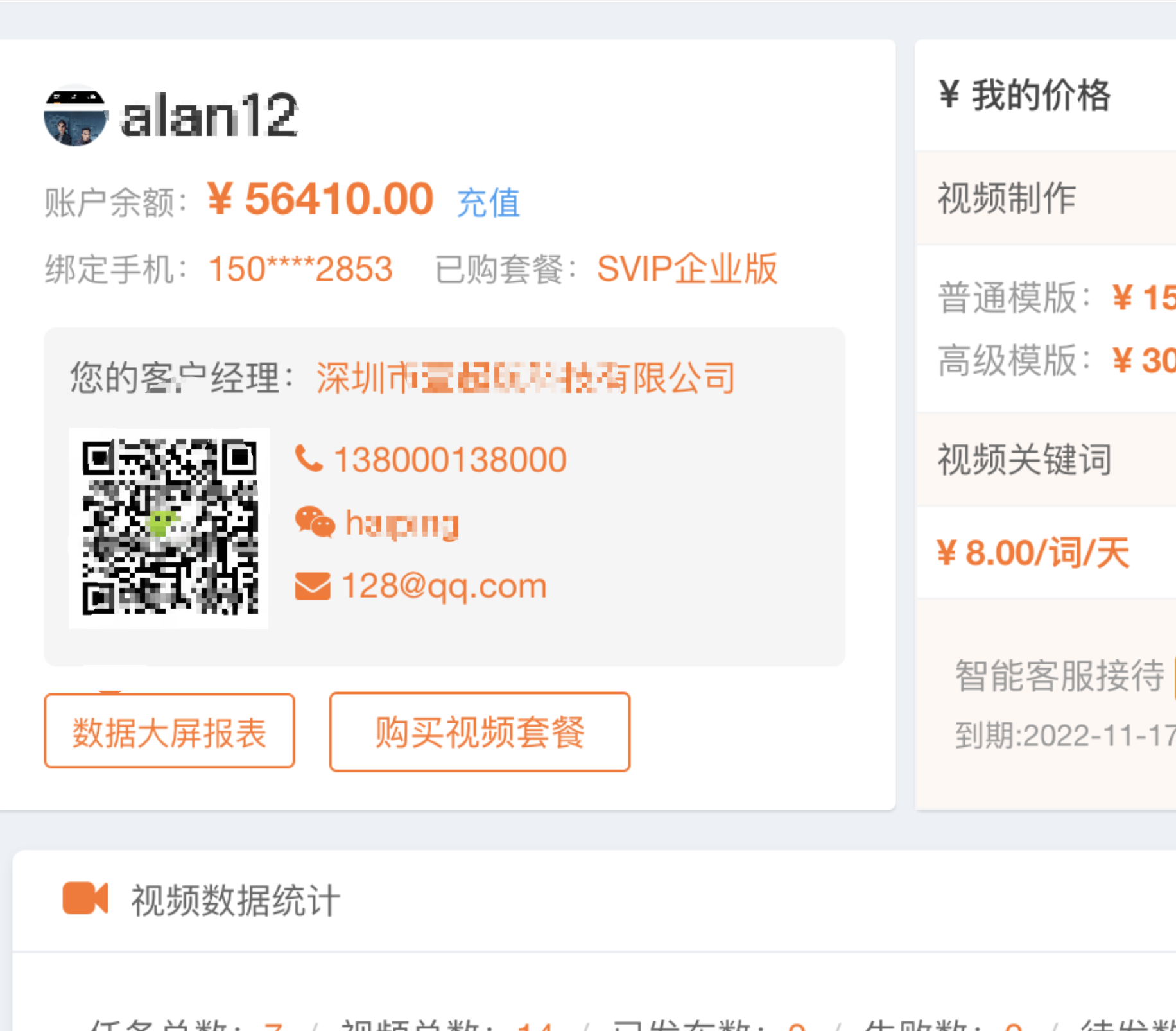 第二、视频端后台首页,去掉了渠道,改为售后客户经理联系方式(在渠道后台-》渠道设置->联系方式里设置)